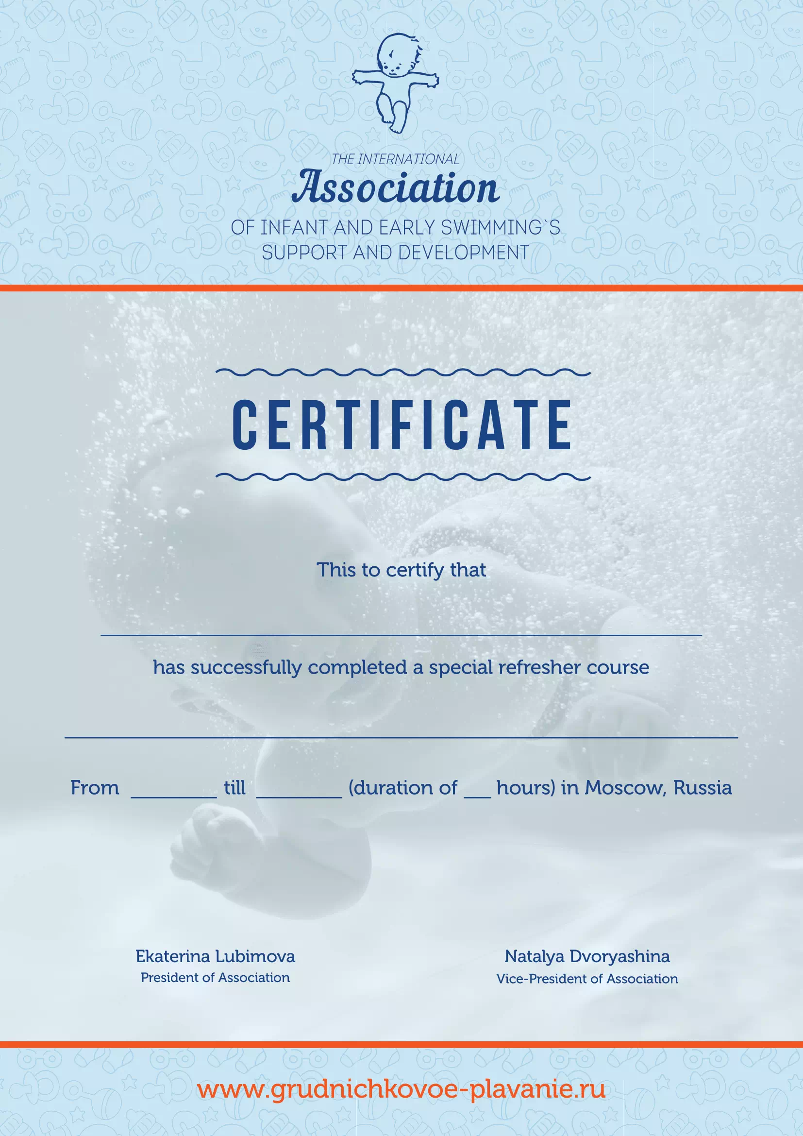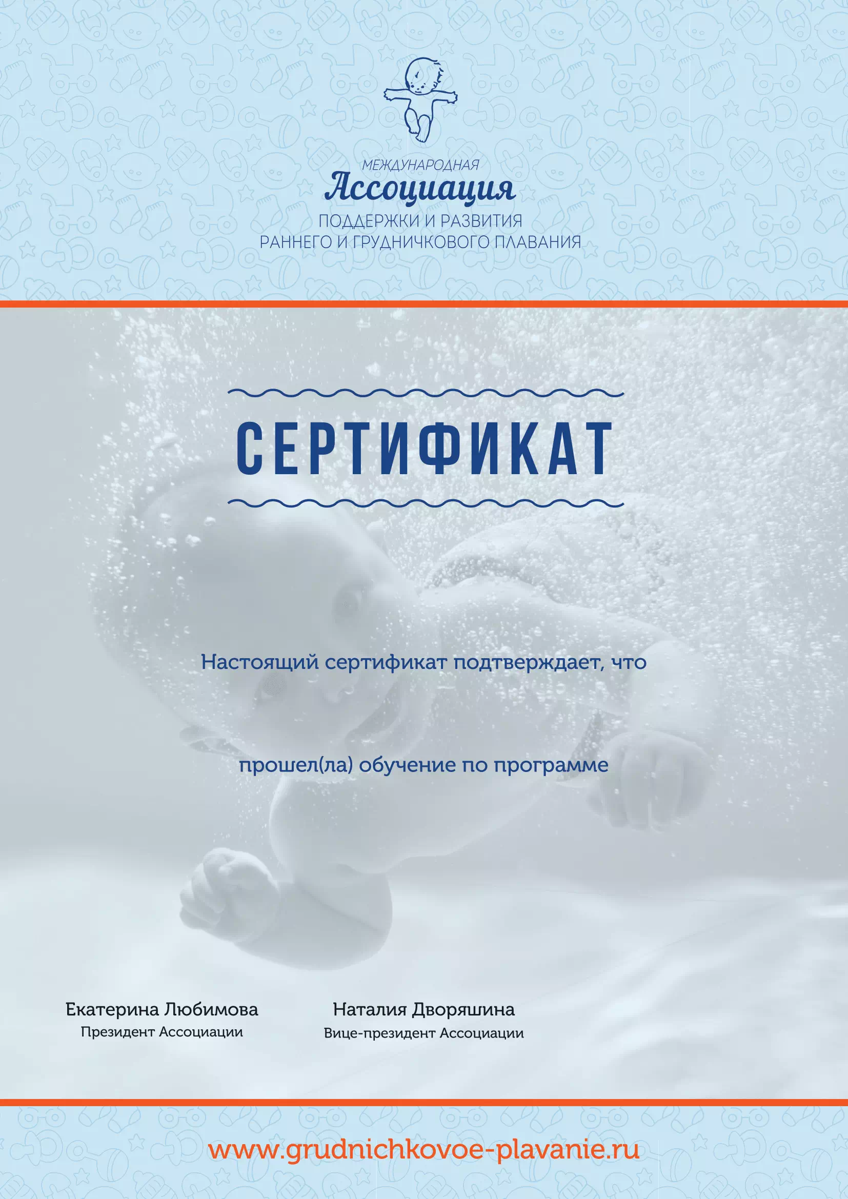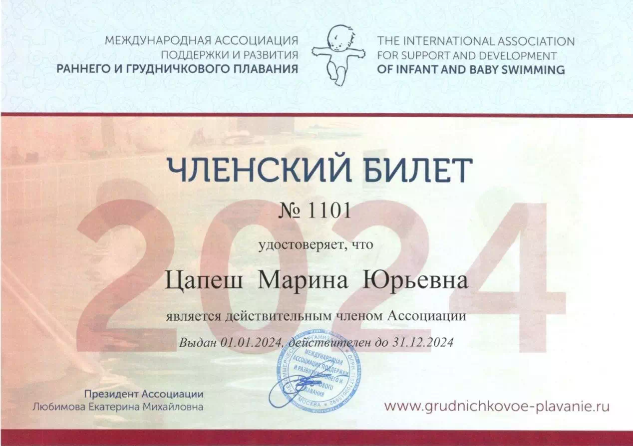 После прохождения курса выдаётся сертификат от международной ассоциации грудничкового и раннего плавания